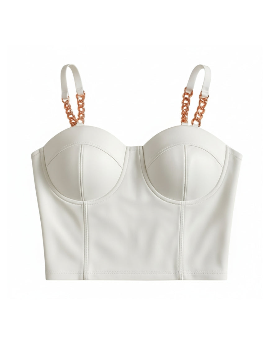Make a bold statement with this structured Faux Leather Corset Crop Top. Crafted from smooth, high-quality faux leather, this top features a flattering sweetheart neckline and defined bust cups for a perfect fit. The adjustable chain-link shoulder straps add a luxurious, edgy detail, while the fitted silhouette creates a stunning, waist-defining look. It's the ultimate piece for a night out, festival, or to elevate any high-waisted bottom! Available in multiple colors including Emerald Green, Vibrant Red, and Crisp White
